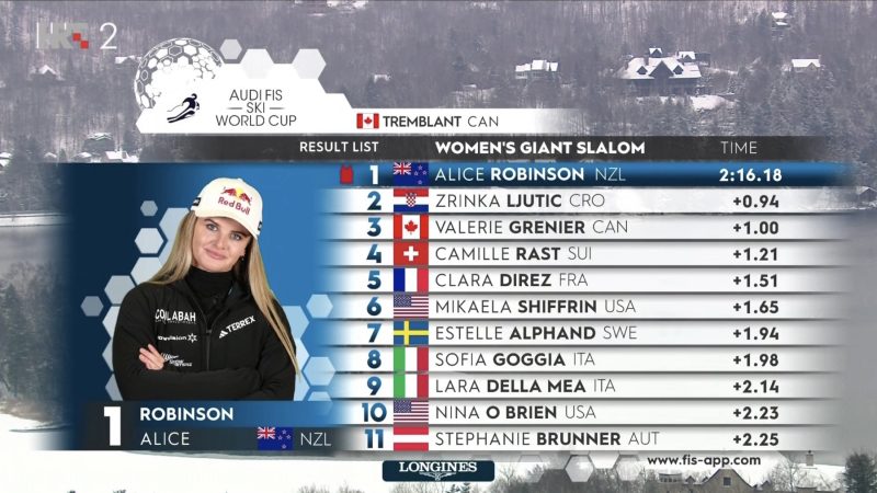 Subotnjim slavljem Robinson je preuzela i vodstvo u redoslijedu veleslalomašica sa 232 boda, druga Austrijanka Julia Scheib ima 180, dok je Ljutić treća sa 142 boda.