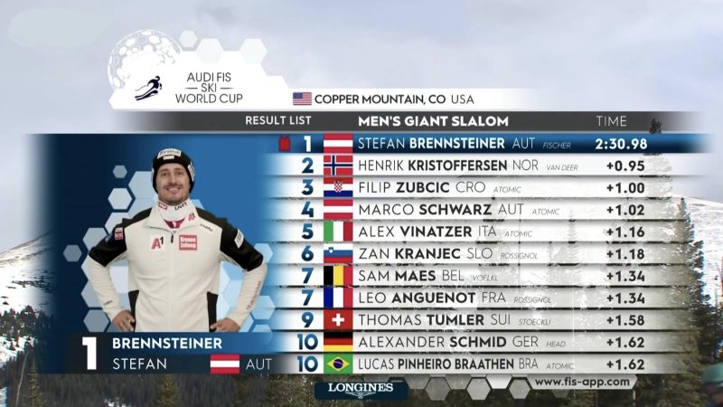 Nakon dva održana veleslaloma ove sezone Brennsteiner je vodeći i u ukupnom redoslijedu u ovoj disciplini sa 150 bodova, 20 manje ima drugoplasirani Marco Schwarz, a 34 manje treći Kristoffersen. Zubčić je šesti sa 76 bodova.